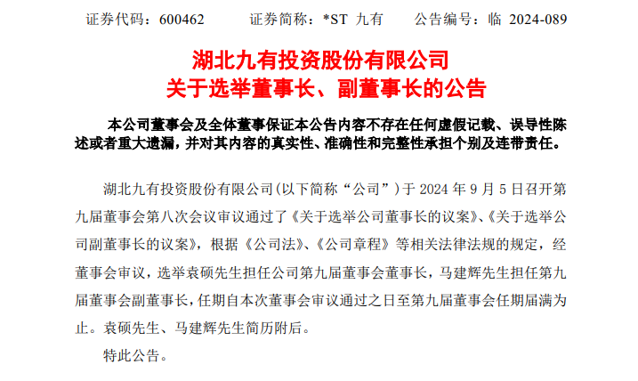 据公告,经*ST九有董事会审议,公司选举袁硕担任公司第九届董事会董事长,马建辉担任第九届董事会副董事长,任期自本次董事会审议通过之日至第九届董事会任期届满为止。