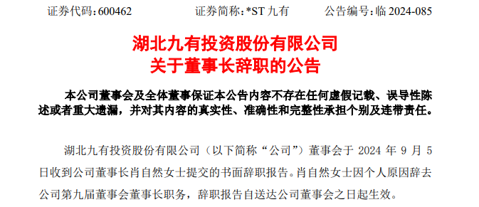 9月5日晚,*ST九有(600462)公告,公司董事长肖自然提交书面辞职报告,同时当天该公司召开第九届董事会第八次会议,选举出新一任董事长及副董事长。