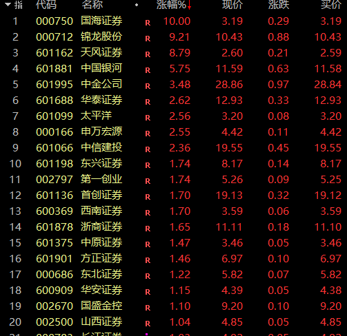 券商股早间放量高开高走,板块指数一度涨近3%,创1个月来新高,开盘不到半小时成交就超过昨日全天成交。国海证券开盘一字涨停,锦龙股份、天风证券、中国银河也一度触及涨停。