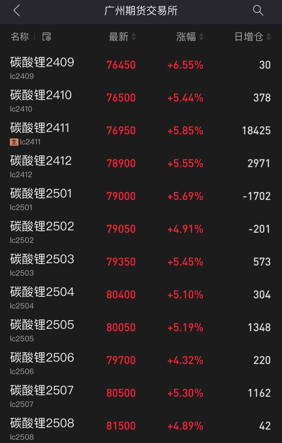 早间,碳酸锂期货主力合约放量高开高走,盘中飙升逾7%,截至发稿,涨幅收窄至5.85%。所有合约持仓量增加逾2.5万张,总持仓达到41万张,创历史新高,这也是碳酸锂期货合约总持仓历史首次突破40万张。