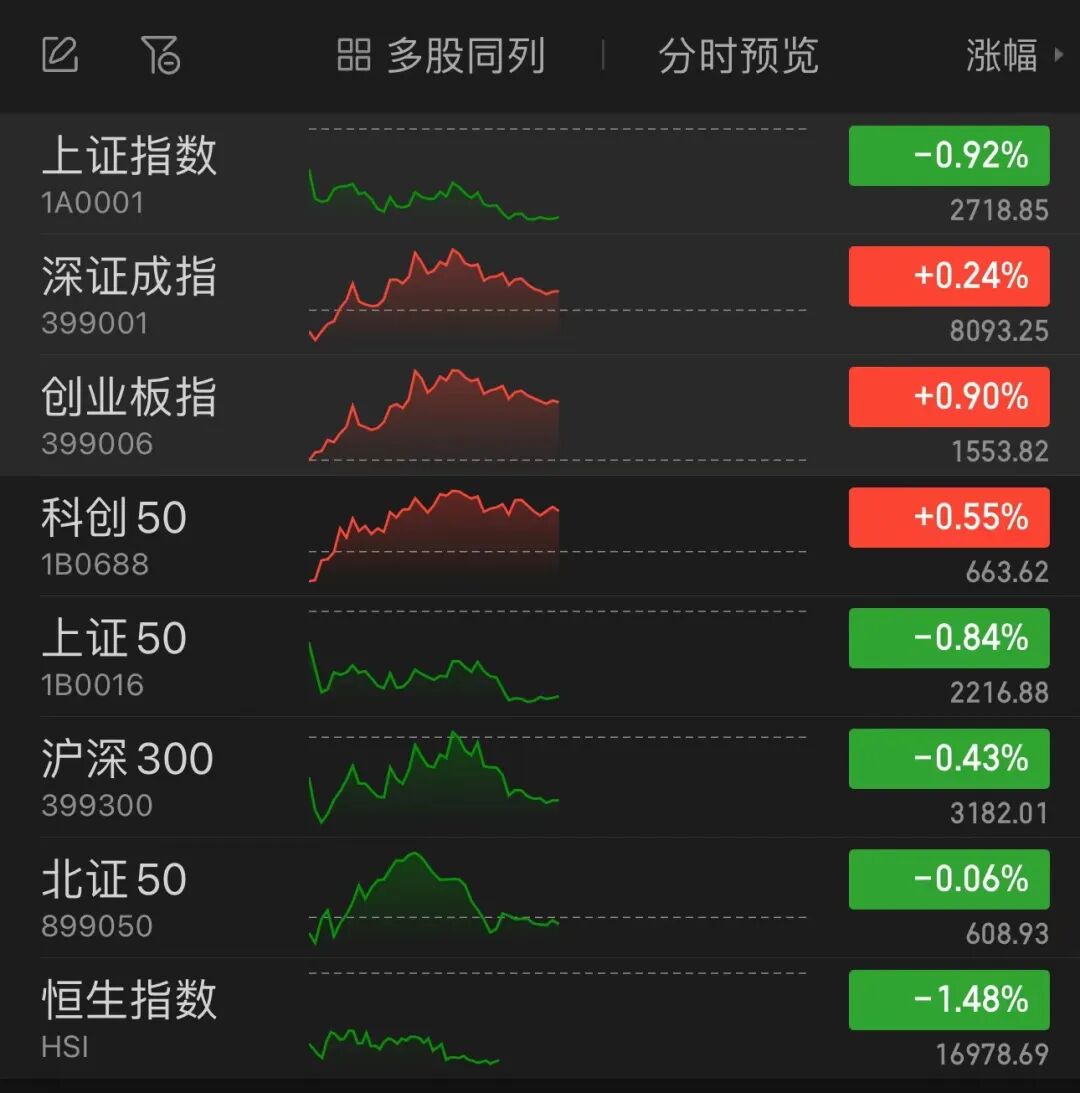 今日早盘,A股小幅震荡,大盘蓝筹股集体调整,上证50承压,放量下挫再创阶段性新低。科技成长股则表现活跃,创业板指盘中涨逾1%,科创50指数亦小幅走高。
