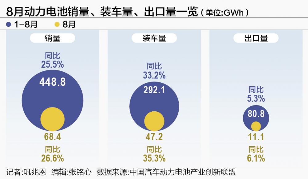 今年8月,国内动力电池装车量达47.2GWh,环比增长13.5%,同比增长35.3%,去年同期这一数据为46.8%,增速有所放缓。