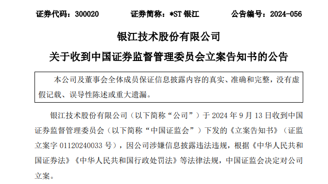 9月13日晚间,*ST银江(300020)也发布公告称,收到中国证监会下发的《立案告知书》,因公司涉嫌信息披露违法违规,证监会决定对公司立案。不过,公告并未指出*ST银江因何事涉嫌信息披露违法违规。