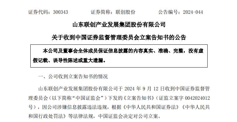 9月13日晚间,联创股份(300343)公告,公司于9月12日收到中国证监会下发的《立案告知书》,因公司涉嫌信息披露违法违规,中国证监会决定对公司立案。