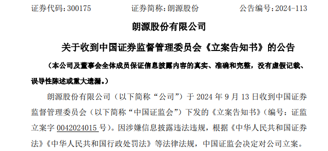 朗源股份(300175)9月13日晚间公告,收到中国证监会下发的《立案告知书》。因涉嫌信息披露违法违规,证监会决定对公司立案。