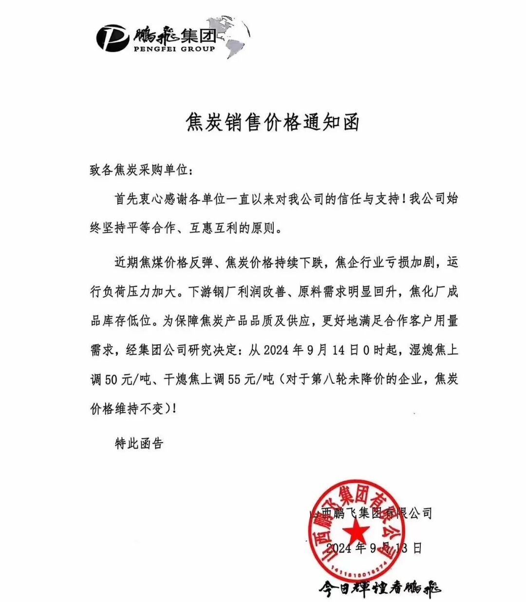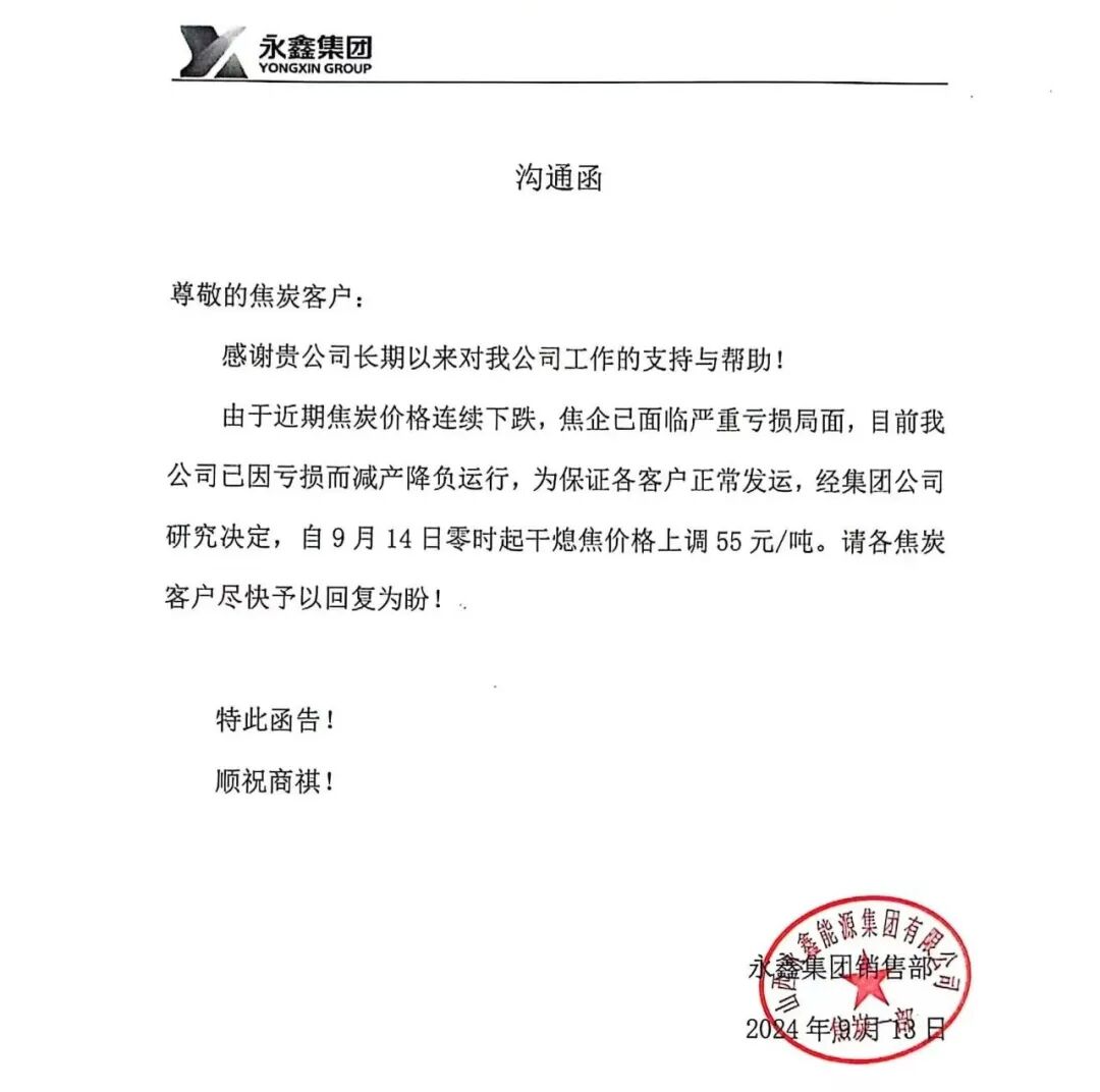 近日,有焦化企业发布涨价沟通函和通知函。