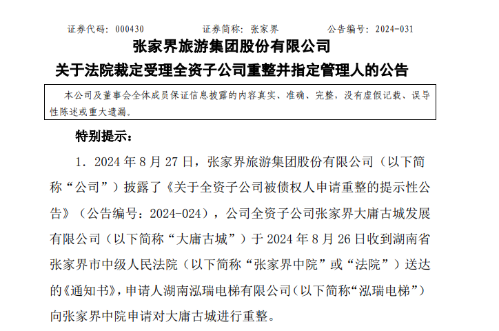 回溯前情,8月27日,张家界全资子公司张家界大庸古城发展有限公司(以下简称“大庸古城”)于8月26日收到张家界市中级人民法院(以下简称“张家界中院”)送达的《通知书》,申请人湖南泓瑞电梯有限公司(以下简称“泓瑞电梯”)向张家界中院申请对大庸古城进行重整。