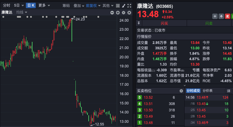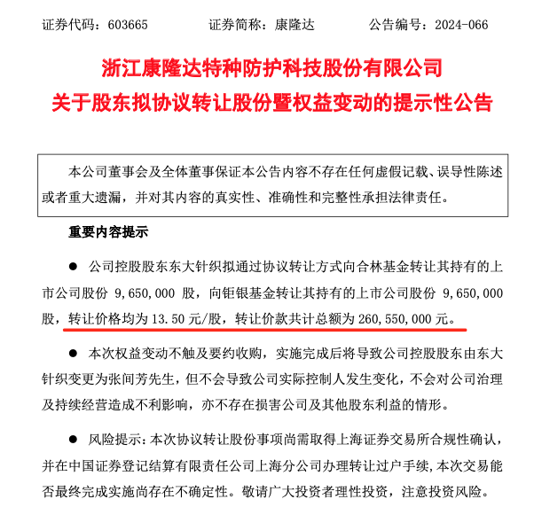 9月23日晚间公告显示,康隆达控股股东东大针织,拟通过协议转让方式向合林基金、钜银基金分别转让其持有的上市公司股份965万股,转让价格均为13.5元/股,转让价款共计2.6亿元。这一交易价格与康隆达最新收盘价(13.48元/股)基本相当。