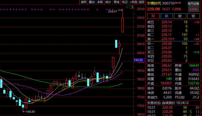 龙头股创业板“一哥”宁德时代盘中一度放量大涨逾9%,创1年来新高,1小时成交接近昨日全天成交,这也是今日创业板指大涨的重要原因之一。
