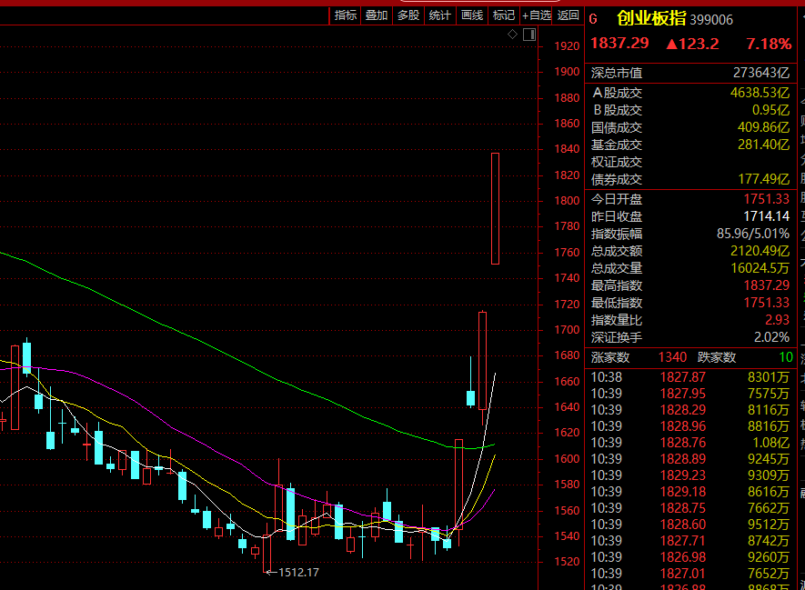 今日早盘,A股在利好的刺激下,继续高开走强,成长股领涨,创业板块指大涨逾7%,突破1800点;深证成指则直接开于9100点之上,并快速上攻,站上9300点。上证指数、上证50指数受银行等大盘蓝筹股冲高回落影响,涨幅略有回落。