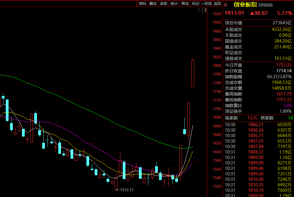 截至发稿,两市超4700只个股上涨,成交呈现加速放大的趋势,不到半小时成交就超过5000亿元,为年内同期最高水平。