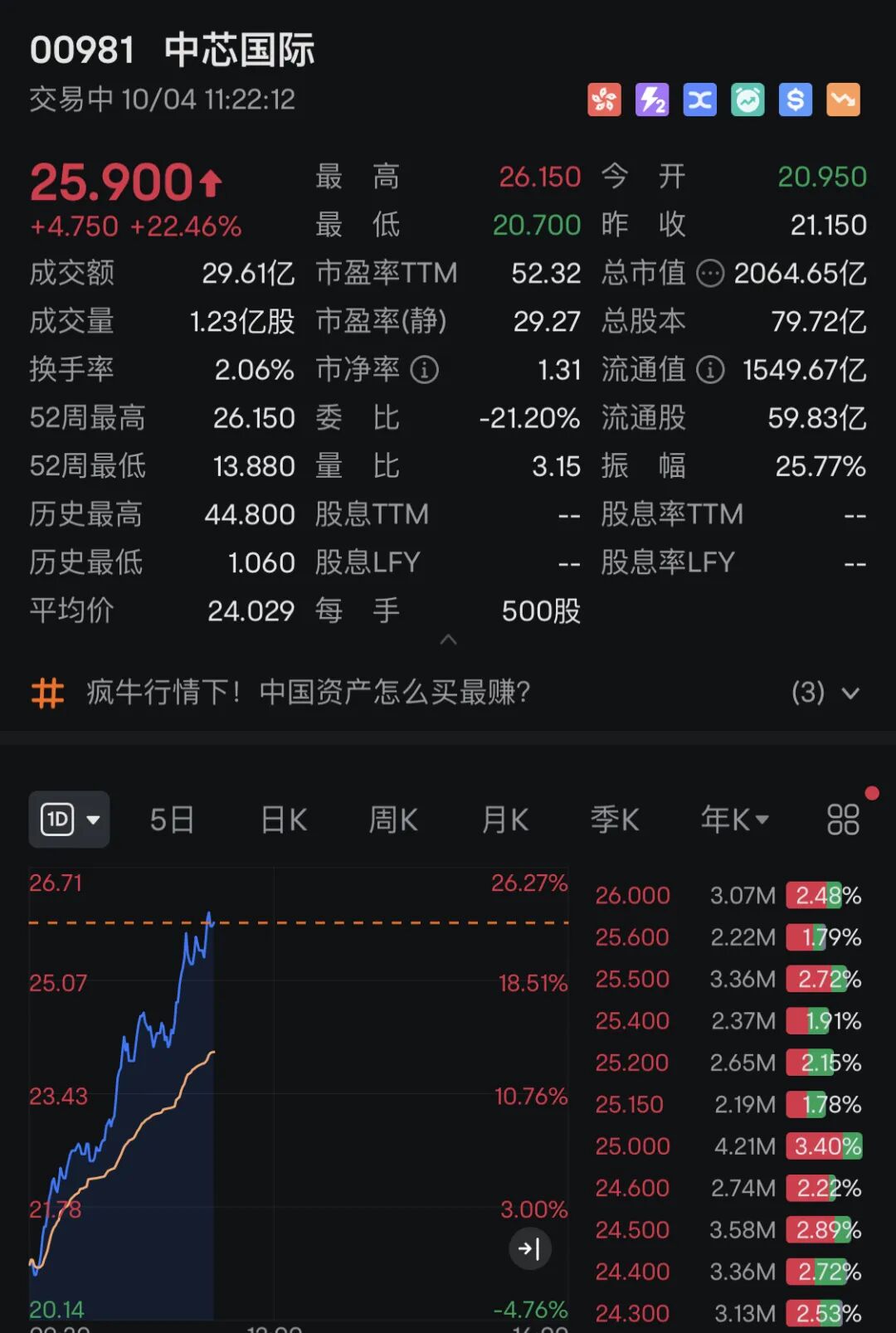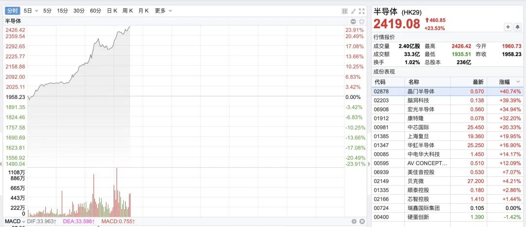 就个股来看,脑洞科技(02203.HK)当天早盘涨幅一度达到50%,位列半导体涨幅榜首。
