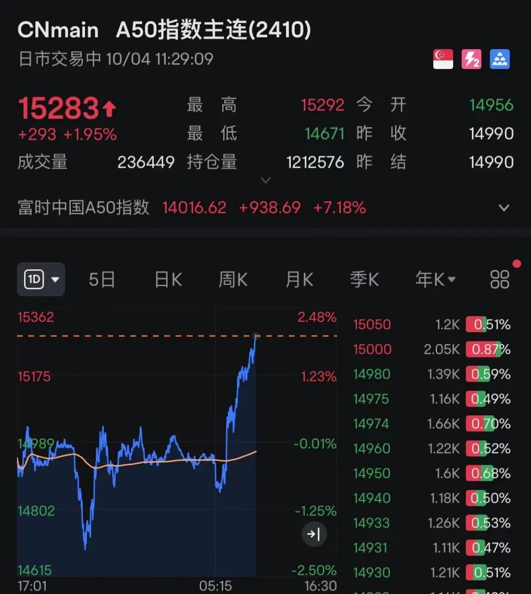此外,富时中国A50指数期货直线拉升,涨约2%。