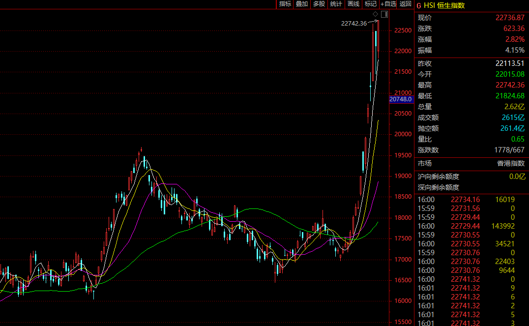 10月4日,恒生指数今天早盘低开98点后,虽然一度跌穿22000点,但很快资金买盘重现,指数掉头向上,尾盘更是急升,突破22700去年初高位,刷新两年半新高,主板成交约2615.3亿港元。