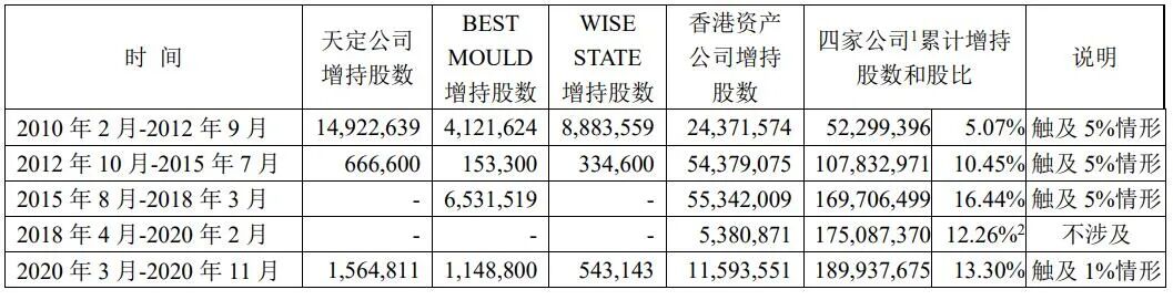 证券时报·e公司记者注意到,在长达10多年的时间里,上述三家公司持续买入鄂尔多斯B股股份,累计买入数量达7868.55万股(含红股)。算上其持股,羊绒集团方面控制的鄂尔多斯B股股份已超过55%。天定公司等增持行为曝光背后,羊绒集团的信披违规问题也同步凸显。