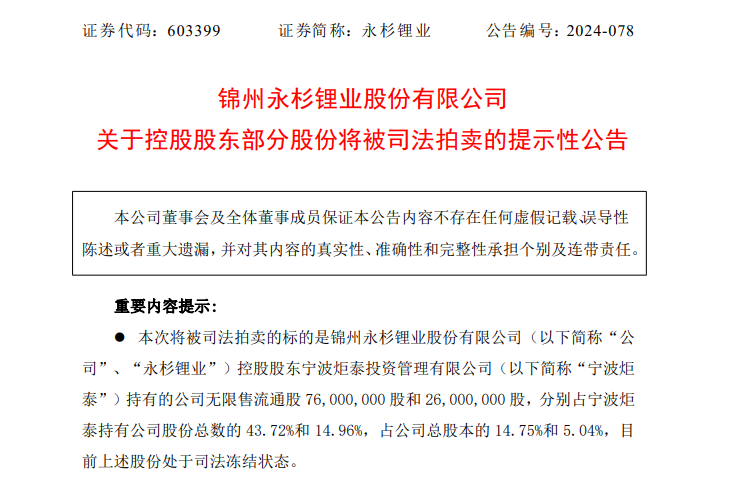 公告显示,宁波炬泰持有的永杉锂业无限售流通股7600万股和2600万股,将于10月31日—11月1日,在京东网络司法拍卖平台公开拍卖,起拍价分别为3.38亿元和1.16亿元。