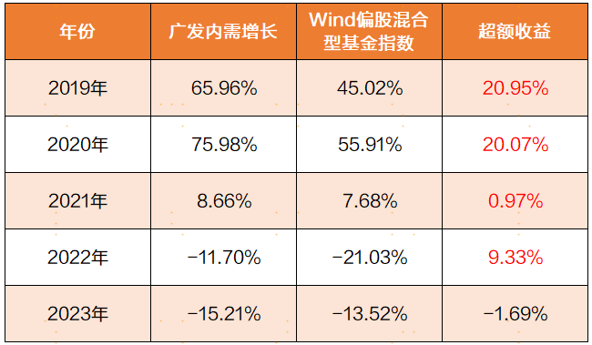 广发内需增长不仅长期表现居前,单论每年的业绩也不逊色,自王明旭于2018年10月17日管理以来的5个完整年度(2019~2023年)里,有4个年度战胜Wind偏股混合型基金指数,唯一跑输的年份,差得也不多,只差不到2个百分点。