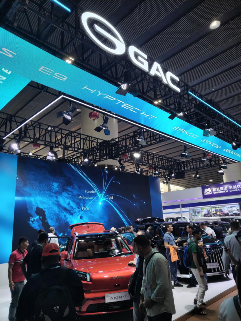 在新能源汽车及智慧出行展区,广汽集团将最新的新能源汽车开进会场,吸引了大量海外客户“火爆围观”。据现场工作人员介绍,本次展示的第二代AION V是广汽埃安首款全球战略车型,也是广汽首款欧洲战略车型,拥有400V+3C的快充技术,适配全球充电桩。同时,广汽飞行汽车GOVE的模型也在展区亮相。