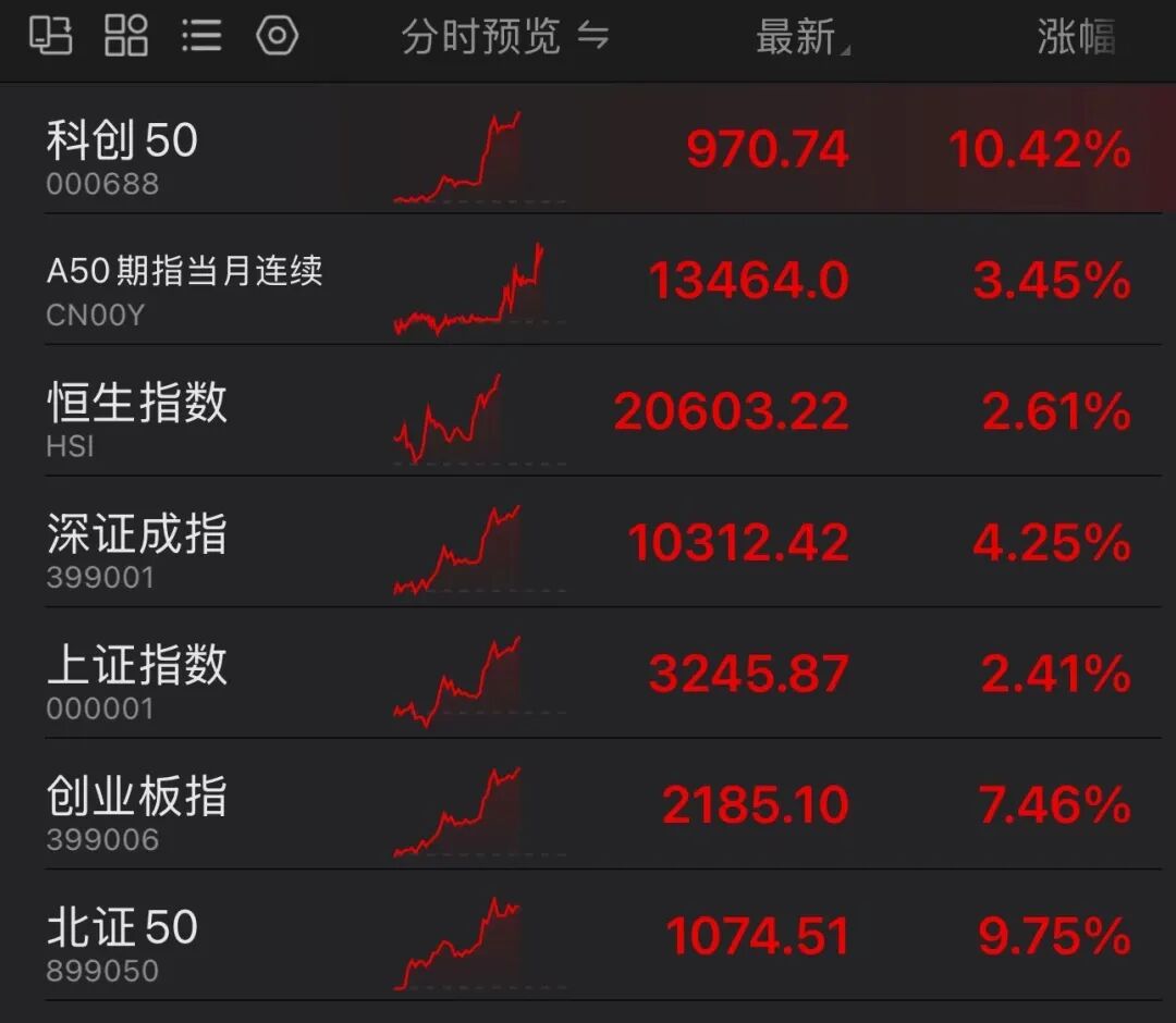 10月18日午后,在多重利好的刺激下,A股开盘快速拉升,科创50指数一度放量飙升逾11%,最新涨幅为10.42%。创业板指也大涨近8%,深证成指大涨超4%。