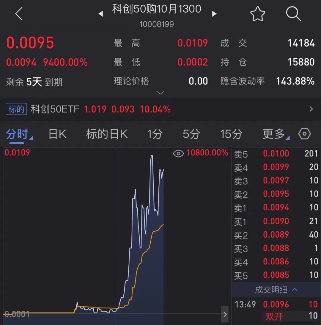 科创50ETF看涨期权再度集体暴涨。“科创50购10月1300”盘中一度涨约108倍。