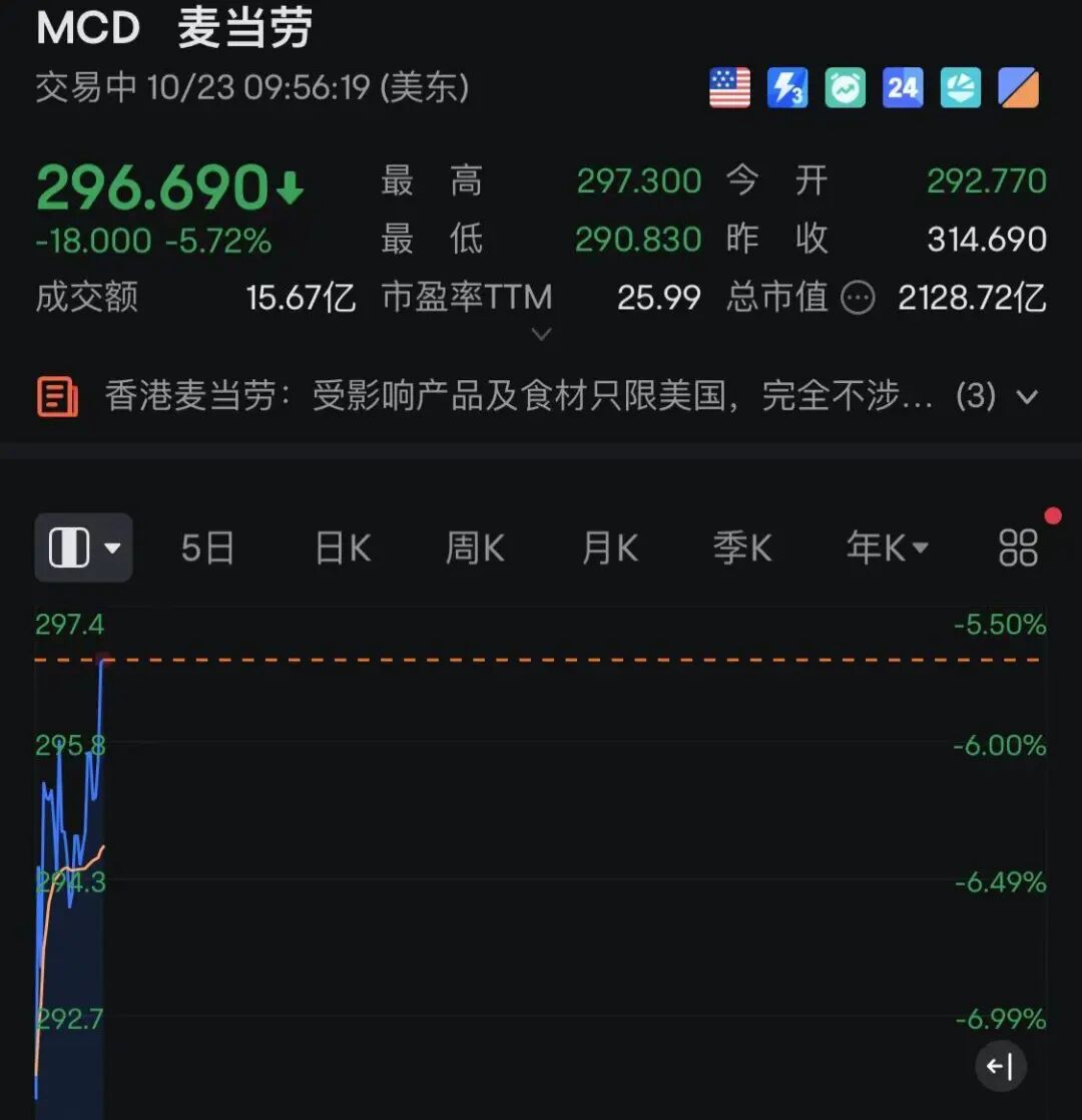 美股个股方面,其中,麦当劳跌逾5%。