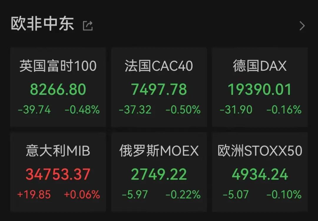 欧洲方面,各大股指也纷纷处于飘绿的状态。