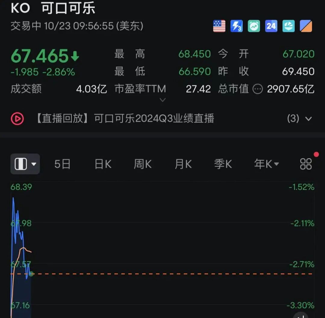 此外,可口可乐跌超2%。消息面上,可口可乐Q3营收119.5亿美元,同比下降1%,分析师预期为116亿美元;净利润28.5亿美元,同比下滑7.8%;调整后每股收益0.77美元,分析师预期0.74美元。期内价格组合即一系列产品的价格,上涨10%,而总单位箱销量下降1%,分析师预期增长0.42%。