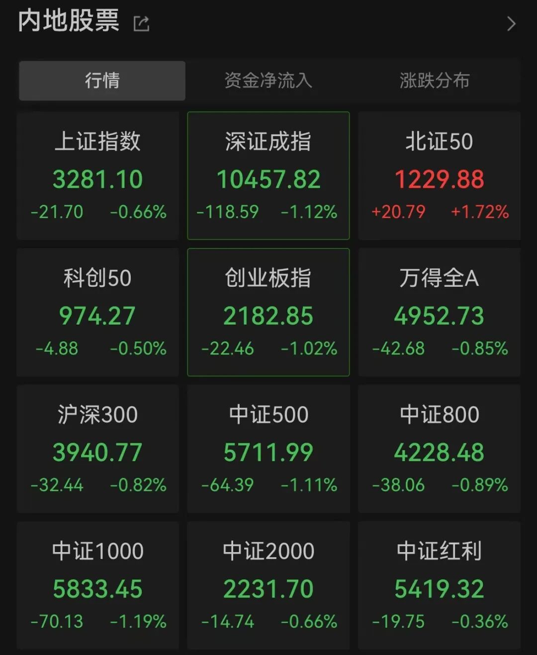 10月24日早盘,A股三大指数集体低开。截至发稿,创业板指跌幅扩大至1%,上证指数跌0.74%,深证成指跌1.05%。
