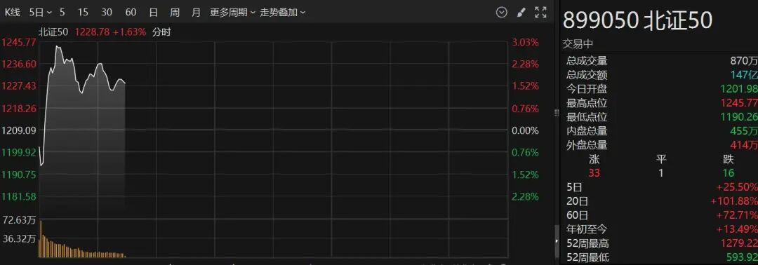 北证50指数盘中拉升,一度涨超3%,美邦科技30CM涨停,七丰精工、艾能聚等涨超20%。