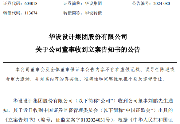 华设集团(603018)10月28日晚间公告,收到公司董事刘鹏通知,其于近日收到中国证监会出具的《立案告知书》,中国证监会决定对刘鹏因涉嫌短线交易予以立案。