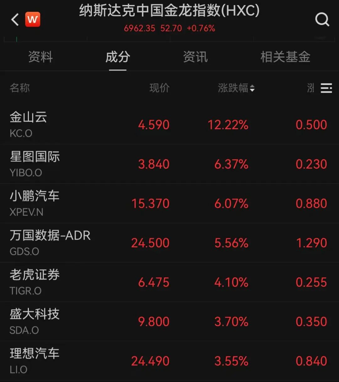多只中概股大涨,纳斯达克中国金龙指数高开逾1%。截至发稿涨幅收窄至0.76%。金山云、小鹏汽车、理想汽车等中概股涨超3%。
