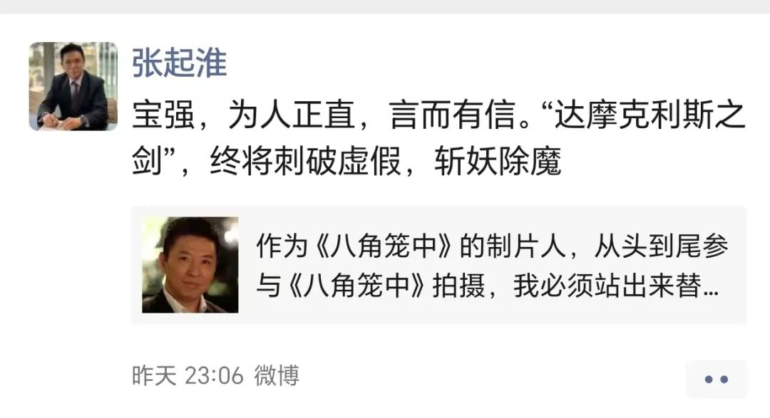 刘勇发文获得知名律师张起淮留言力挺,张起淮在朋友圈发文,称“宝强,为人正直,言而有信,‘达摩克里斯之剑’终将刺破虚妄,斩妖除魔”。