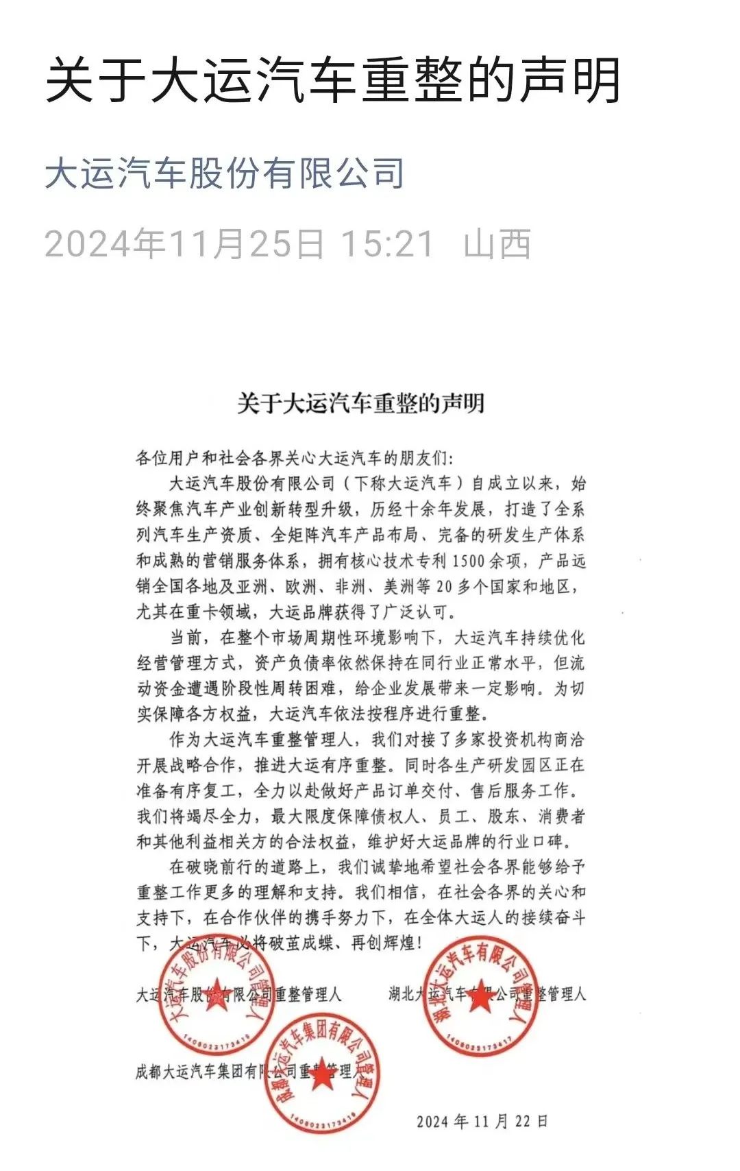11月25日,大运汽车官方公众号发布了一纸关于大运汽车重整的声明,回应近期破产相关传闻。