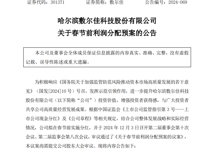 12月3日,敷尔佳(301371)召开董事会会议,审议通过了《关于春节前利润分配预案的议案》,结合上市公司整体发展战略和实际经营情况,敷尔佳拟在春节前实施分红。