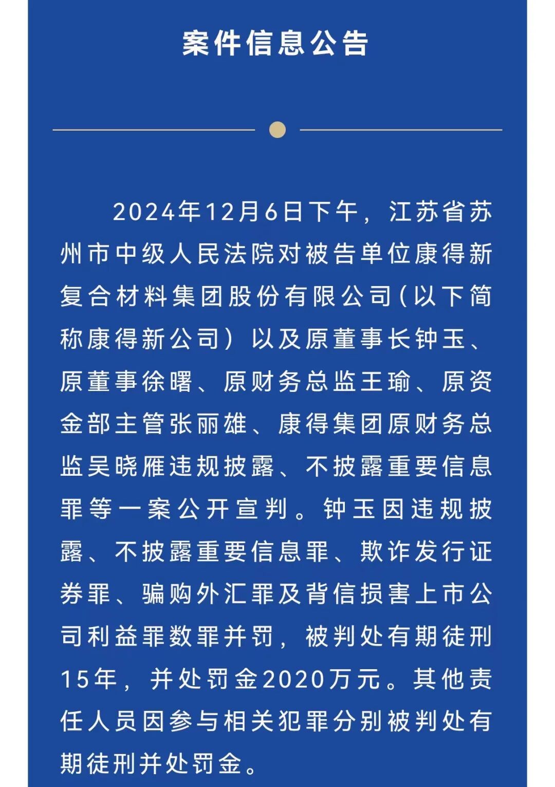 根据苏州市中级人民法院最新发布的消息,12月6日下午,苏州市中级人民法院对被告单位康得新以及原董事长钟玉、原董事徐曙、原财务总监王瑜、原资金部主管张丽雄、康得集团原财务总监吴晓雁违规披露、不披露重要信息罪等一案公开宣判。钟玉因违规披露、不披露重要信息罪、欺诈发行证券罪、骗购外汇罪及背信损害上市公司利益罪数罪并罚,被判处有期徒刑15年,并处罚金2020万元。其他责任人员因参与相关犯罪分别被判处有期徒刑并处罚金。