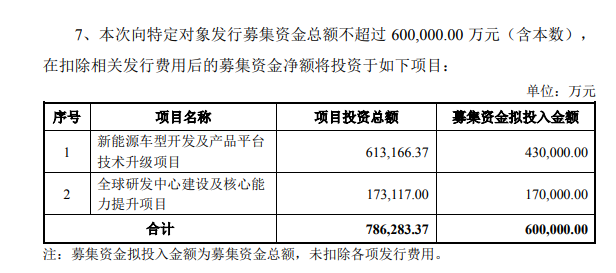 本次向特定对象发行募集资金总额不超过60亿元,将投资于新能源车型开发及产品平台技术升级项目和全球研发中心建设及核心能力提升项目,其中前者项目投资总额61.32亿元,募集资金拟投入43亿元,后者项目投资总额17.31亿元,募集资金投入额为17亿元。