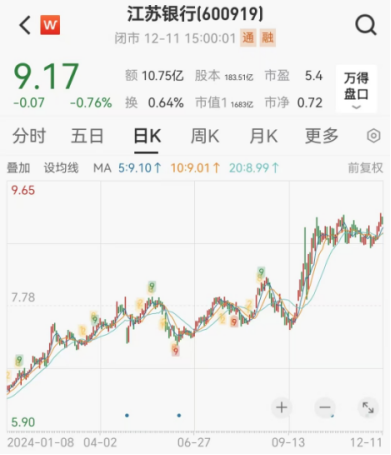 今年以来,江苏银行股价上涨明显。Wind数据显示,年初至今,江苏银行涨幅超过46%。12月11日,江苏银行收于9.17元/股,股价已处于近年来的相对高位。
