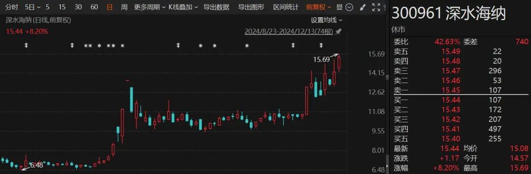 二级市场上,深水海纳股价近期出现上涨行情,12月以来累计涨幅超43%。