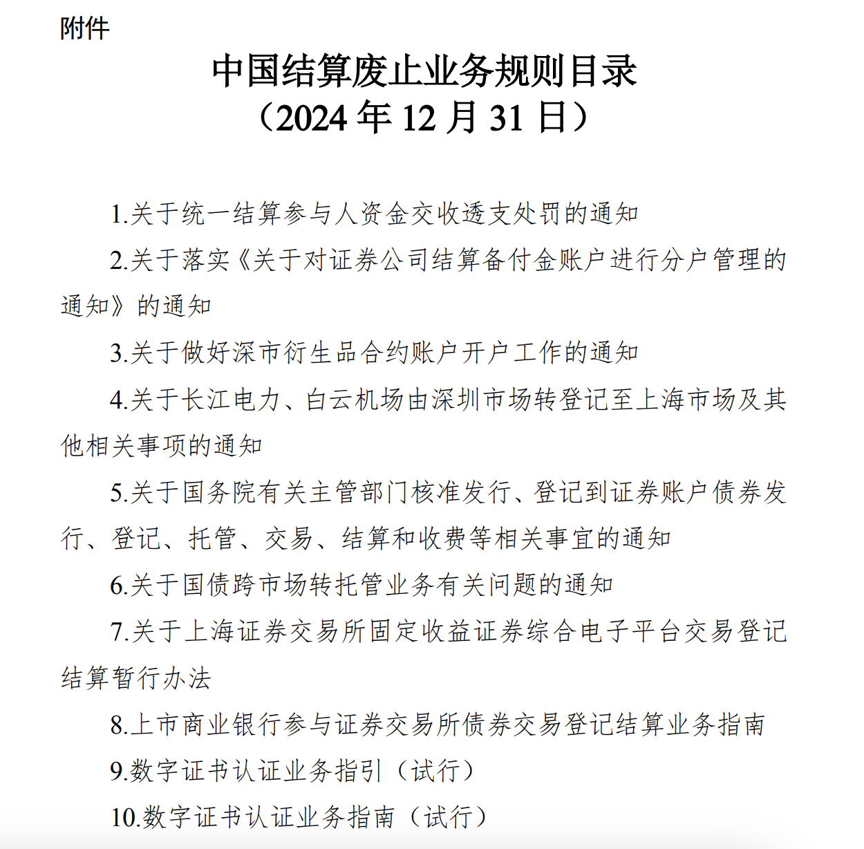 证券时报网讯,中国结算发布公告称,经研究,决定废止《关于统一结算参与人资金交收透支处罚的通知》等10件业务规则,废止决定自2024年12月31日起生效。