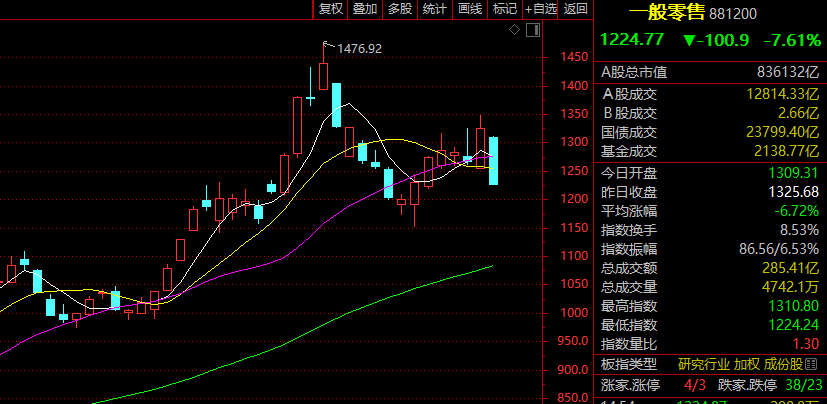盘面上,行业板块多数下跌,贵金属、煤炭、石油化工等少数板块飘红。零售板块集体大幅调整,十余只相关个股跌停。互联网、教育板块、软件、休闲用品等板块跌幅居前。沪深两市超4600只个股下跌。