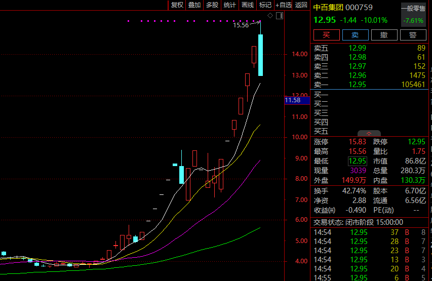 6连板中百集团今日开盘后股价小幅上涨,一度创出历史新高,午后股价跳水,触及跌停。