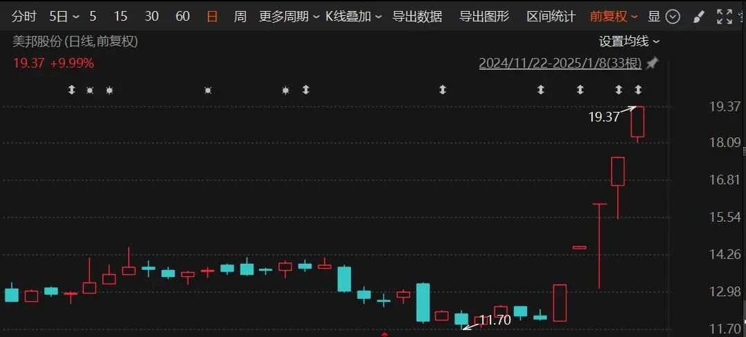 从股价表现来看,该股已经成为今年开年以来“最靓的仔”。2025年1月2日起,美邦股份已经连续5个交易日涨停,最近5个交易日换手率分别为2.5226%、2.6101%、13.6011%、10.5012%、5.1101% ,成交金额分别为4432.38万、5127.53万、2.71亿、2.41亿、1.32亿,交易指数高于以往水平。