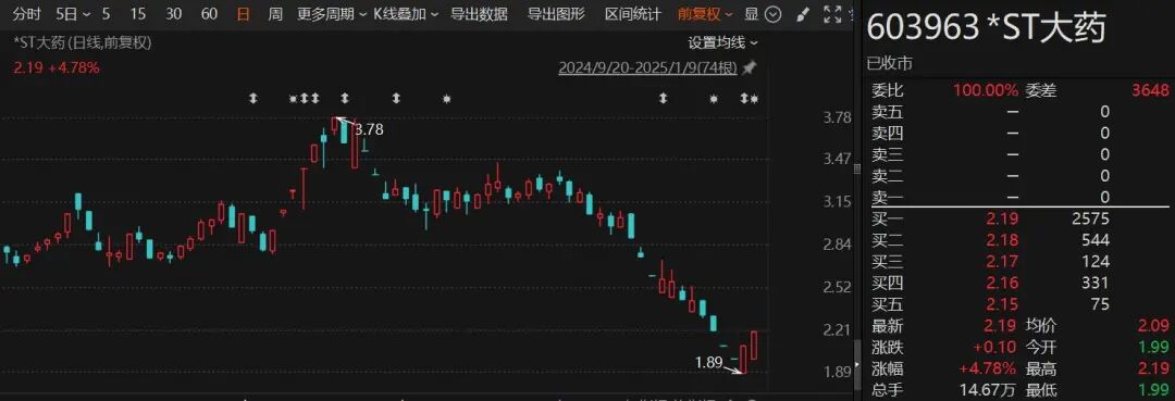 此外,还有一重退市风险指向交易类。*ST大药2025年1月3日收盘价为2.20元,市值为4.83亿元,首次低于5亿元。1月9日,公司股票收盘价为2.19元,市值为4.81亿元,已连续5个交易日收盘市值低于5亿元。根据规定,上市公司出现连续20个交易日在上海证券交易所的每日股票收盘总市值均低于5亿元情形的,上海证券交易所将决定终止公司股票上市,属于交易类强制退市。