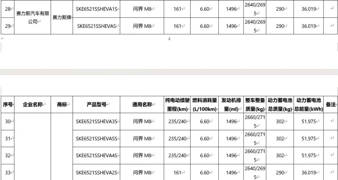 问界M8此次申报了6种不同版本车型,提供161/235/240km三种纯电续航,燃料消耗量(预计为馈电状态)6.60L/100km。