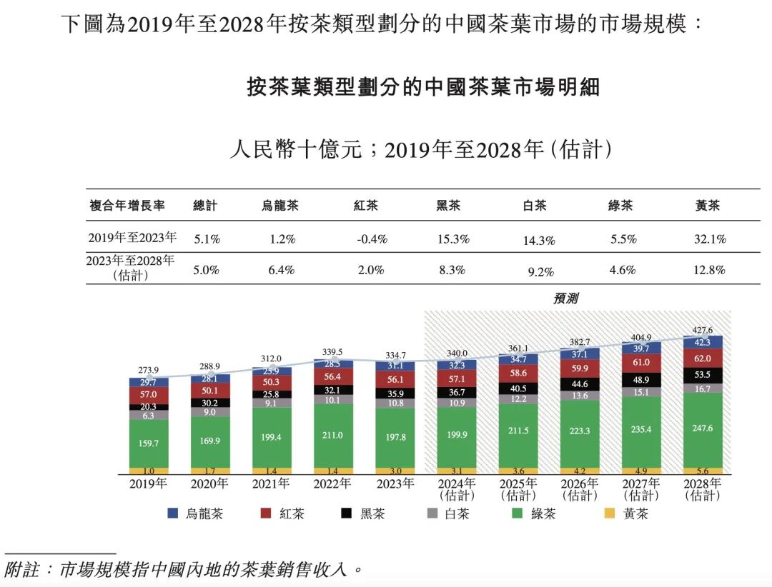 根据弗若斯特沙利文的资料,中国茶叶市场整体规模由2019年的2739亿元增长至2023年的3347亿元,复合年增长率为5.1%,并将进一步增长至2028年的4276亿元,2023—2028年复合年增长率为5%。