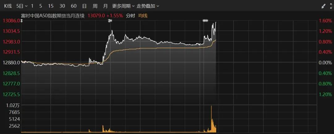 富时中国A50指数期货盘中拉升,一度大涨超1.5%,截至发稿,涨超1%。