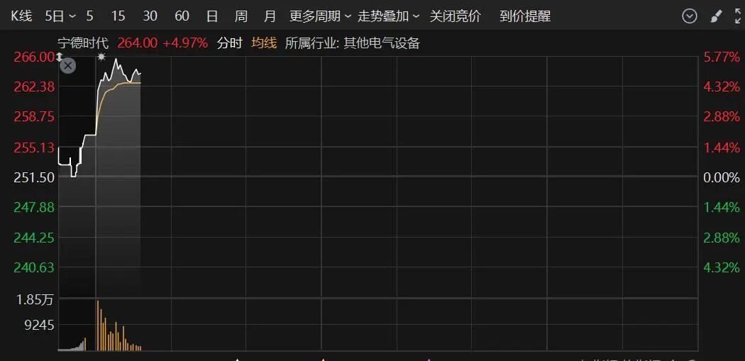 其他个股方面,宁德时代开盘后直线拉升,大涨近5%。