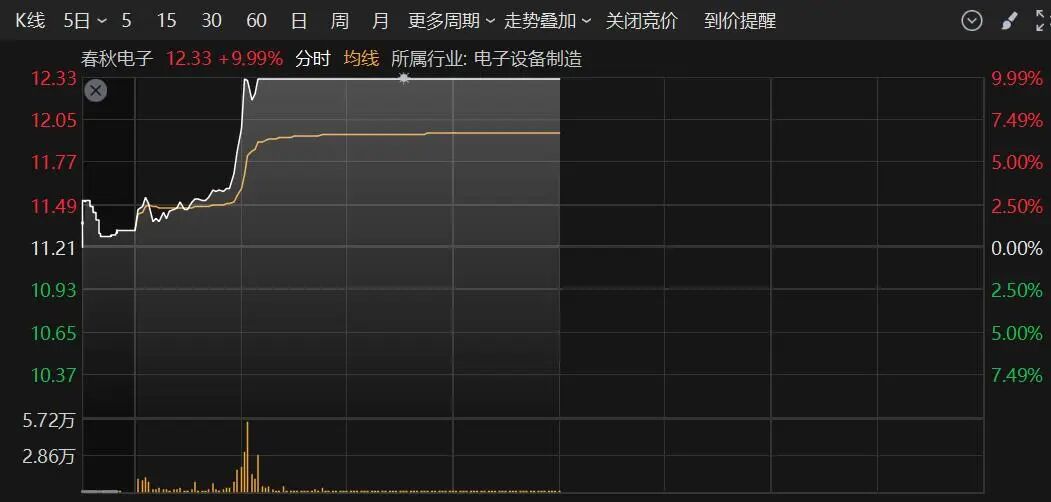 消费电子概念早间同样放量高开高走,板块指数涨近3%,创年内新高。瀛通通讯开盘一字涨停,连续第3日封板,春秋电子也直线拉涨停,胜蓝股份、显盈科技等涨幅居前。