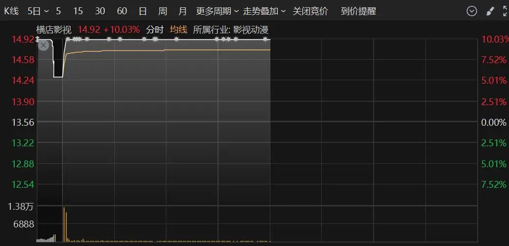 影视院线概念早间全线高开高走,板块指数盘中一度放量大涨逾4%,半日成交超前一交易日全天成交。横店影视高开后仅约1分钟就强势涨停,金逸影视亦直线封板,幸福蓝海、博纳影业等涨幅居前。