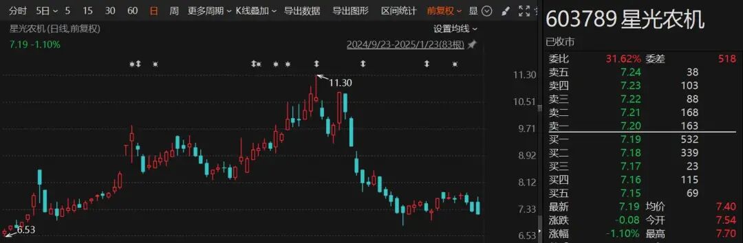 星光农机亦公告,预计2024年年度利润总额亏损1.2亿元到1.8亿元,归属于母公司所有者的净利润亏损1.1亿元到1.7亿元。预计2024年年度实现营业收入2.65亿元到3.05亿元,扣除与主营业务无关的业务收入和不具备商业实质的收入后的营业收入为2.5亿元到2.9亿元。根据相关规定,公司股票在2024年年度报告披露后将可能被实施退市风险警示(*ST)。